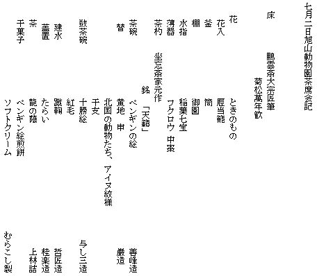最初は遠慮がちに遠目で眺めていた方々も「どうぞ」という声掛けでお席へいらして下さいました。動物園での開催でしたのでお道具にも色々な動物が登場し、とても楽しんで頂く事が出来ました。また、お菓子の「ペンギン絵の煎餅」と「ソフトクリーム」には歓声が上がり、「食べずに持って帰ろう」と言う方が多くいらっしゃいました。