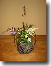 | 同支部の楡青年部と同日にそれぞれリレーすることがわかり、同じ会場内、二席設けて行いました。 柏青年部は一足早い七夕をイメージした席にしました。(北海道は8月7日が多いです)年に一度しかあえない織姫と彦星、今年も会えますようにと祈りながら。3年に1度の全国大会にむけ、夜はだめでも、昼間動ける会員にお手伝いいただきながら、夜だけの会員も含め、19名が参加しました。 花は親先生からいただいた、ヤブレ傘・ピンクのアワモリソウ・バイカウツギ・山藤・ピンクの都忘れと、花だらけでしたが、全国大会のチャリティ展観で購入した籠を用いました。 |