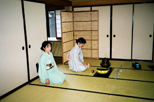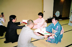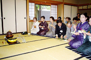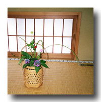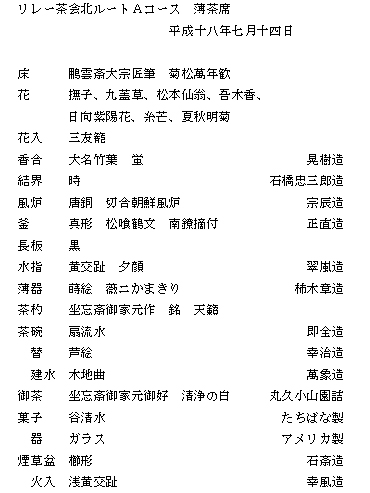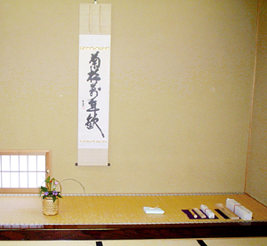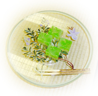 | 大宗匠のお軸、お家元のお茶杓が、岩手から青森に渡ってまいりました。 当日は、梅雨明けを思わせる快晴、そして、今年一番の暑さとなりました。 冷房がない茶席の中で「涼」を感じていただけるよう、襖を外し簾をさげ、ガラスの結界や「岩清水」と銘した菓子などで工夫いたしました。 簾を通して入ってくる自然の風に「天籟」を聞き、お越しくださった皆様のお言葉から「菊松萬年歓」のエールをいただけたように思いました。 |