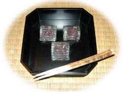 | 当日は、梅雨の晴れ間となりお天気に恵まれ、親先生を始め、大勢の支部会員の皆様においでいただくことができました。寄り付きに淡々斎宗匠の色紙「瓢絵 不老仙」をかけさせていただいて、濃茶席で大宗匠のお軸「菊松萬年歓」とお家元のお茶杓を使わせていただき、お客様の平穏とますますの幸せを祈ると共に、夏らしさや涼しさを感じていただけるようなお道具組をと心がけました。 また、季節柄旧の七夕を席中で楽しんでいただきたく、主菓子に「星合ひ」と銘をつけ、牽牛星に見立てたひとひらの金箔が、薄茶席で青年部手作りの琥珀糖の織姫に出会うようにしたところ、その物語性が楽しいとお客様に大変喜んでいただけました。 |