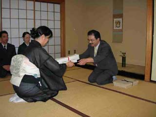 | 茶会前日の7月22日、山形支部青年部連絡会代表の池田宗甫代表によりA・B両コースのお軸とお茶杓が福島県に届けられました。 伝達式は薄井ブロック長、木田副ブロック長のご同席のもと、ふくしま青年部、いわき青年部合同で執り行われ、Aコースがふくしま青年部に、Bコースがいわき青年部へリレーされました。 |