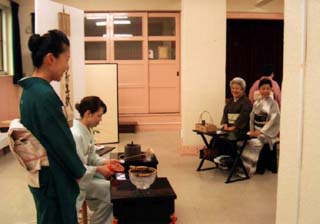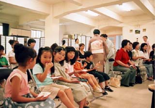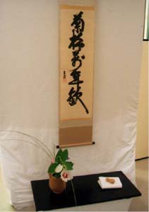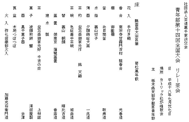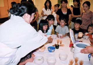 茶会を始めるにあたり、最初の一碗をマリア様に捧げ、参加した青年部会員全員で全国大会とリレー茶会の成功を祈念しました。待合はパイプオルガンの響くお御堂。その静謐な空間は茶室とは違った緊張感があり、席入れを待つ間、お客様には静かなひとときをお過ごしいただけたようです。茶会には幹事長先生をはじめ諸先生方や同門の方々など予想を上回るお客様においでいただき、ありがたく思っております。また、催し等でジョイント茶会をしている栃木県立宇都宮女子高等学校の茶道部員のみなさんや、教会に併設された幼稚園の子どもたち、出張出前講座の小学生や養護学校の生徒さんが、80名近くも参加してくださいました。宇都宮青年部は子どもたちを意識した活動を心がけていますが、今回も子どもや初めてお茶に触れる方に、お茶をより身近に感じていただこうと体験コーナーを設け、感想を書いてもらいました。これを機会に地域とのかかわりをより深くしていきたいと思っています。 |