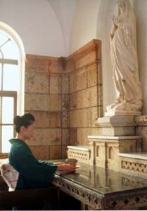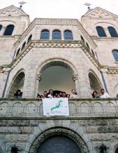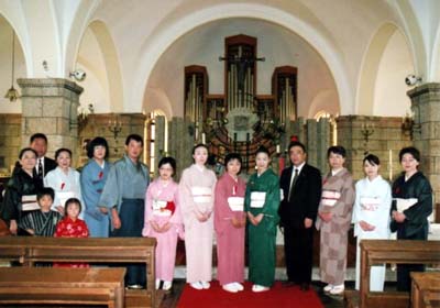 今回私たちが会場に選んだ場所は、国の有形文化財に指定されている、大谷石造りの宇都宮カトリック松が峰教会でした。市の中心地にありながらも荘厳さを保ち、二つの尖塔を有するその美しいたたずまいは誰の心をも魅了するものがあります。全国大会のテーマである「祈り」にこれほど相応しい場所はないと、神父様にお許しをいただき茶席を設えることができました。