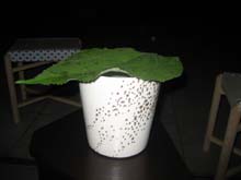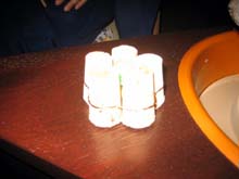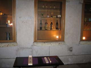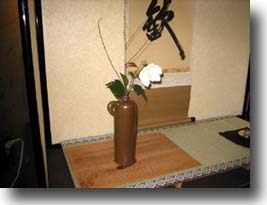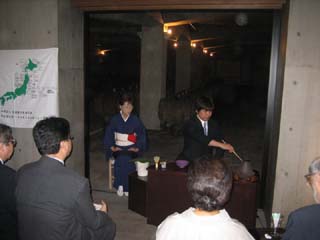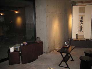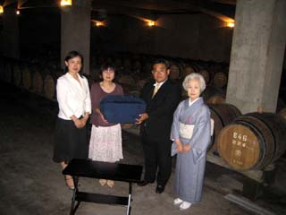 お道具は殆どが見立て持ちよりでありました。蓋置はワインのコルクを針金でまとめて間にビー玉を入れて涼しげに、香合は山梨グッドデザイン賞受賞作品のワインオープナー、花入は旧式の陶器製のワインボトルを使わせていただきました。また、お点前さんの後方にはワインの樽が沢山並んでいて、地上は35度以上の山梨でしたが地下にあるワインセラーは冷房無しで涼しくいることが出来ました。 |