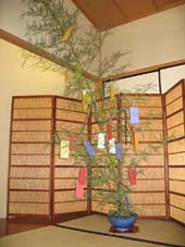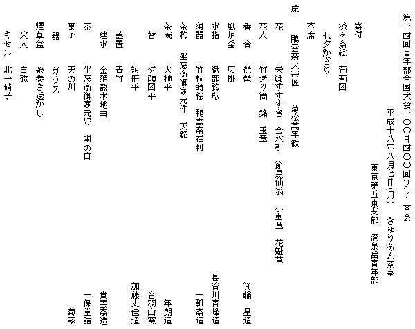 | 全国大会のテーマ「祈り」に寄せて、旧暦の七夕にちなんだ「星に願いを」をメインテーマとして皆で工夫し席を設えました。平日ではありましたが、幸い晴天に恵まれ、幹事の先生方はじめ多くのお客様方がおいでくださいました。 寄付きには、淡々斎宗匠による葡萄の絵の掛け物と、当日の朝切り出した笹竹を飾り、短冊にお客様の願い事を書いていただきました。このリレー茶会の成功を祈ってくださった方、世界平和を祈られた方、家族の健康など、様々な願い事が五色の短冊にしたためられました。 糸巻きと牛の置物も飾らせていただき、しばし七夕を楽しんでいただきました。 本席の小間ではリレーされてきたお軸に、茶杓荘にてお茶を召し上がっていただきました。この日は北海道を出発し46日目でしたが、これまでの青年部の想いを感じながら、そしてお客様の祈りを噛締めながらの席でした。 諸先生方、先輩方には準備段階から多岐に渡るご指導を賜り、ようやくこの日を迎えることができましたこと、心より御礼申し上げます。 |