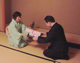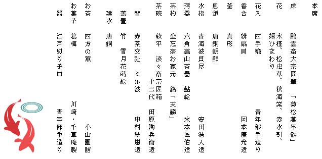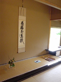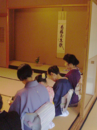 | <実施概要> 寄付と本席の構成でおもてなししました。 寄付では、夏の風情を表した床飾りで、香煎としてチャイティーをお出ししました。南国では体温を下げるために香辛料を効かせたお茶を飲する習慣があることから、チャイティーを選びました。また、お菓子にはくまさんクッキーをお出ししましたが、子供はもちろんのこと、先生方も何10年ぶりに食べたとの声も聞かれ、喜んでいただけました。 お茶杓の銘「天籟」からヒントを得て床に風鈴を配し、目にも耳にもお道具の意味を理解できるよう工夫したつもりです。 本席は10畳のお部屋でおくつろぎいただきました。点前は置き水指・二碗点で、床が大きいのでお花をにぎやかに5種入れました。 お客様は5歳の子供、中国人の方、イギリス人の方をはじめ60人を超える方々がお見えになり、にぎやかで楽しく有意義なお茶会となりました。 <感 想> 台風7号が接近し、午前中から雨が激しかったのですがお茶会の始まるころには雨がやみ、夕方には夕焼けでお部屋の中まで赤くなりました。 お道具の鑑賞やリレー茶会の意義をゆったりした時間の中で十分に伝えられたと思っています。また、部長だけでなく青年部会員それぞれが席主を勤めました。このようなことができるのもリレー茶会の機会を与えてくださったからで、お家元、大宗匠に感謝しています。 |