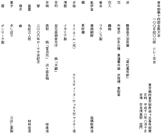 | 東京第四東支部自由ヶ丘青年部は、8月10日に中央区日本橋にある茶友倶楽部空門にて青年部第14回全国大会リレー茶会を開催いたしました。 平日ということで、夕方からの開催となりました。猛暑の中にもかかわらず約60名の方々のご参加をいただきました。 自由ヶ丘青年部では、大会のテーマ「祈り」に因みまして「平和を祈る」をテーマにいたしました。受付の床には国連旗をイメージしてオリーブの葉でリースを作り、その中に鵬雲斎大宗匠の扇面を掛けさせていただきました。 暑い最中の開催ですので、いらして下さるお客様に少しでも涼しさを感じていただけるように工夫をいたしました。 受付の後お席に入る前に冷たい麦茶でおもてなしをいたしました。 「平和を祈る」には、世界が手をつなぐ事、文化を知ることが大切ということで、各会員が持っている世界各国のお道具やお茶碗を見立てて使い、お客様からは好評を頂きました。 薄茶4席をいたしまして、次の青年部にお道具を引き渡し無事終了しました。 親支部の先生方のご指導と、会員の協力のもと盛会の内に終えることが出来ましたことに深く感謝申し上げます、ありがとうございました。 |