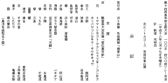 | 前夜、府中の瑠璃青年部より拝受し、8月17日(木)14:00〜16:30新宿「光林坊」においてリレー茶会を開催しました。 同支部の世田谷白雲青年部と同時開催、準備の段階において、2席の対比・特徴・バランス・連携を考えながらの進行でした。 当日青年部スタッフ参加13名。幹事長先生、育成委員の先生、青年部の部長、ブロックの方も多数駆けつけて下さり、私達スタッフ含め110名の参加でした。 蒸し暑い中いらっしゃったお客様に、香煎席にて、グラス(小)にシークアーサーの皮を浮かべた冷水にて涼をお取り頂き、当日朝、青年部名を入れた旗を飾り、全国大会エントリーの冊子も閲覧して頂きました。心配していた雨も、小雨が時々パラつく程度でしたので外の蹲を通ってのお席入りが叶いました。 大宗匠のお軸、お家元のお茶杓が、私達にどの様な青年部を目指す様に仰せ言われているのかその意味を皆で考えさせて頂くこととなりました。 私達ルートのお茶杓「天籟」の意より「夏の自然の風が聞こえる様な風情を」テーマにお道具組をすすめていきました。 お薄器・ベネチアングラスはシルクロードを行き来して日本に来た物でありましたが、洋の東西を往復して私達の茶席に届いた器の中のお茶、一杓に込められた、私達に与えて頂いている祈り、そして、私達から今後発信すべき平和への祈りをそこに感じました。 夕刻、次の日の鶯笛青年部の方に無事にお道具と旗をお渡しし、ホッとした中で引き続き懇親会を行い、一日同じ思いで忙しく動いた仲間達と、先生方とで和やかに歓談し、長い一日は終わりました。 今回リレー茶会を開く迄には会議・準備を重ね、当日は力を合わせ、色々な思いを抱きそしてリレーのバトンを次へ渡した時に、この夏の思いを共存出来た事が心から嬉しく感謝しています。 全国大会でこのお軸とお茶杓に再び出会えるのを楽しみに参りたいです。 |
