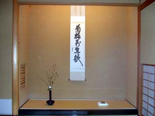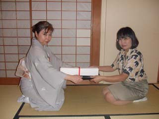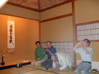| 日本橋青年部では平和への祈りとして「感謝」をテーマにいたしました。自然からの恵み、人々からの恩恵に感謝をするという気持ちを大切に、心を込めて薄茶を差し上げました。また日本橋青年部だけで行う初めてのお茶会だったこともあり、特別にお願いして水に金色の橋をイメージしたお菓子を作っていただき、銘を「日本橋」とさせていただきました。待合では冷たいおしぼりと「東京水」をご用意し、リレー茶会と「東京水」についての説明をいたしました。夕刻のお茶会にもかかわらずたくさんの方にお越しいただいたことに感謝いたします。 |