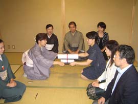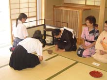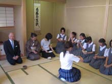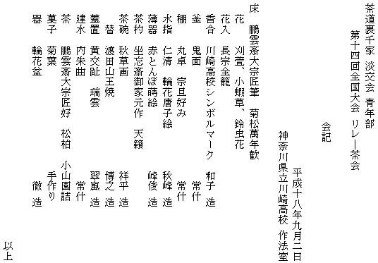 | 川崎高校新校舎建て替え時に出た粘土質の土で焼かれた「山王焼」茶碗や、学校のシンボルマ−クを蒔絵にした香合、そして季節のお道具を取り合わせ茶道部の生徒さんと一緒に和やかな楽しい一日を過ごすことが出来ました。 お忙しい中ご来席頂いた斉藤支部長先生や、特別相談役の野澤宗隆先生に「上手に点てられてとても美味しいですよ。これからも頑張ってね。」とお声を掛けて頂き、恥ずかしそうにうなずくお点前の生徒さんの姿がとてもかわいらしく、いっそう席中が和みました。 また、衆議院議員田中和徳先生には、公務ご多忙な中、Bコースの茶会に続きご来駕下さり、励ましのお言葉を頂戴しました。 リレ−茶会によって高校生との交流が出来たことは大変嬉しいことです。このような機会をお与え下さったお家元、大宗匠をはじめ、いろいろとご尽力頂いた小市宗恵幹事長先生、川崎高校学校長、そしてご協力ご支援下さった先生方皆様に心より感謝申し上げます。 |