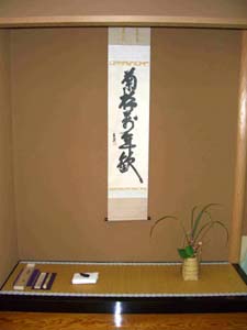 リレーされた大宗匠のお筆「菊松萬年歓」のお軸とお家元作「天籟」のお茶杓に見守られ、緊張しながらも席は始まりました。