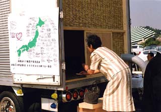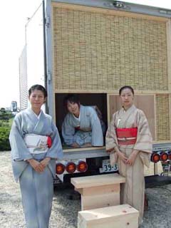 | テーマを「茶レンジ! いつでもどこでも茶の心」としまして、青年部員が所持する2tトラックに和室小間をしつらえた移動茶室で、一日で衣浦青年部エリア内三ヶ所でお茶会を開催させて頂きました。 トラックのにじり口に、お客様は最初、不思議そうな感じで室内を覗きこまれてみえましたが・・・意外や意外!入って頂くと、あまりに落ち着いた空間で驚かれた声もあがりました。 刈谷の会場では、仕事帰りの一般の方にも、お抹茶を楽しんで頂けたら・・・と席を設けました。 会場の移動が多く、お道具の出し入れ等、移動は慌しかったですが、多くの方に青年部のパワーを感じて頂けた席になったと思います。 この移動小間(トラック)で、このまま全国大会へ伺おうと計画中です。皆様に是非実物を見て頂けましたら幸いです。 |