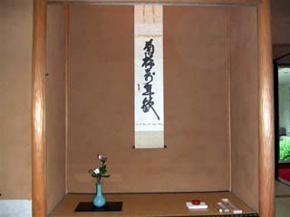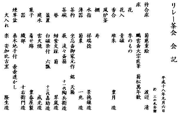 | 秋篠宮文仁親王殿下と同妃紀子殿下に親王殿下の御誕生という御慶事の佳日に、76日目のリレー茶会を行わせていただきました。 当会場のテーマは「未来へ つなげよう 心の絆」とし、合同で行う両青年部の絆を今一度確認すると共に、日頃お世話になっている 親先生の月例茶会と同じ建物の中でさせていただくことで、親(先生)と子(青年部)の絆も深める機会となりました。 親先生の温かいお心遣いで月釜のお客様にリレー茶会の案内をしてくださったので、予想外に大勢のお客様をお迎えする事となり、 盛況のうちに終わる事が出来ました。また、平日で講義があるにも拘わらず合間を見て豊橋技術科学大学の茶道部部長も駆けつけて下さり、頼もしく思いました。 「菊の節句」を意識して玄関から寄付き・本席と「菊」尽くしの中、御参集の皆様と親王殿下の健やかな御成長をお祈りし歓びを分かちあうことができ、真に華やかで御目出度く、いつまでも記憶に残るリレー茶会となりました。 当日参加することが出来なかった両青年部部員も、青年部部旗設置の形で参加をしていただきました。 |