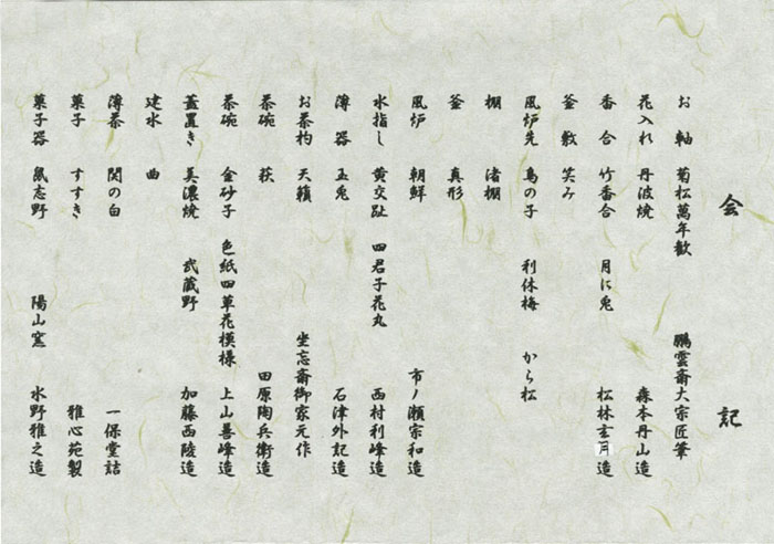| 沼津御用邸記念公園内東附属邸の中の翠松亭にて重陽の節句とお月見をテーマに道具を組みました。 平日昼間のお茶会に親先生はじめ、たくさんの方々がみえてくださいました。 俗世間とは違った時の流れを感じる緑に囲まれたこの場所で富士支部より引き継いだお道具の意味をかみしめながらのお茶会でした。 平日のため、手伝える人が少なく卒業生の方々にお声がけをしたら、快く受けて下さり、たいへん助かりました。 なんとなく親から続いている感じがしました。 残念だったのが、全員がお茶会に集中していたためスナップ写真をとり忘れたことです。 静岡支部の方にお道具を引き継ぎ、全国大会への思いをあらたにしました。 |