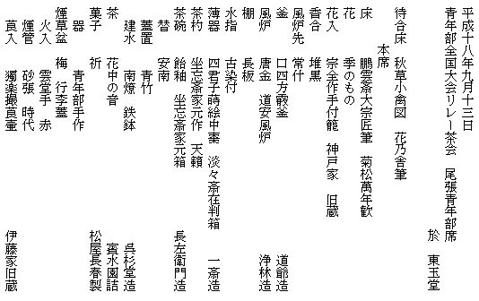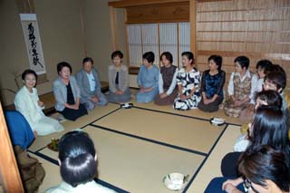 | このお茶会では、たくさんの方のご協力があり、無事終えることができました。 平日ということで、スタッフの人数が足らず、OGの方に声を掛けさせていただいたら快く引き受けてくださいました。 お茶は、5月に青年部会員で、賓水園さんにお邪魔し、茶摘みをしたものを、このリレー茶会にあわせて作っていただきました。お菓子も以前青年部行事でお世話になった松屋長春さん(和菓子屋さん)にテーマに合うものをお願いし、試作品を作っていただいたりもしました。青年部を通じて出会った方に助けていただいたことを感謝しています。 また、スタッフも時間がない中、夜中までかかって準備をしたり、当日も少ない人数の中頑張りました。皆の頑張りのお陰で、お客様にも楽しんでいただけたのでは、と思います。 |