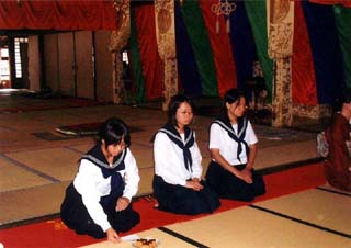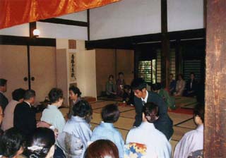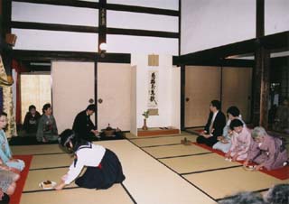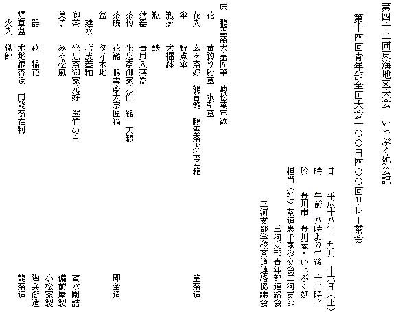 | 第42回東海地区大会・いっぷく処(オプショナル券)にて学校茶道連絡協議会の皆様中心で行わせていただきました。本地区大会サブテーマ「悠久の心をつなぐ茶の世界」のもと、ゆったりとした豊川閣の中で若い力とそれを導くものとが共に一体となり、和やかな雰囲気をかもし出すことができました。地区大会と云う事で御家元はじめ御奥様、伊住宗匠御奥様、大谷様、総本部の皆様にもお席にお入り頂き温かいお言葉や眼差しを頂けましたことは感慨深い思いで一杯であります。また、大勢の皆様にお越し頂け学生たちも大変張り切っておりました。参加者全員が楽しめる機会を頂けましたことを感謝申し上げます。ありがとうございました。 |
