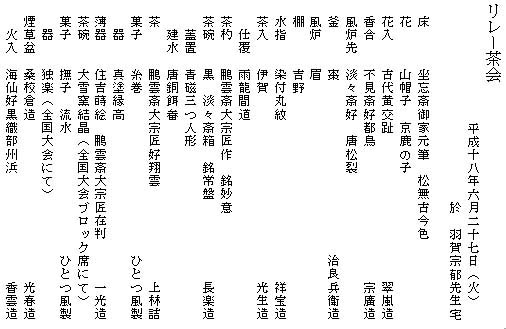 | 長万部にてDATE青年部さんよりバトンを引き渡され、函館へ持ち帰りました。スタートして未だ5日目、ゴールの京都まで無事に着く為にも事故の無いよう、いつもより更に安全運転。 函館では夕方より先生方7名、会員24名、そして引き渡す先の室蘭からわざわざ部長はじめ3名にいらして頂き、3席に分かれ濃茶薄茶を頂きました。 このお道具に込められた深い意味をかみ締めながら、会員それぞれの思いでひと時を過ごせた事と思います。蓋置の三つ人形を「手を繋ぎ輪になって、このリレー茶会のよう」と言って頂き、まさにその通りと思います。 手をとり374の青年部が一つになれる全国大会が益々楽しみになりました。 |