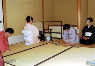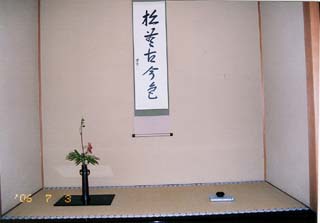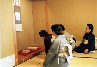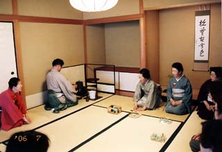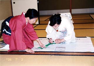 | 北斗青年部は、親先生をお招きして、夏らしいさわやかなお道具組(ガラスの縁高、ガラスの蓋置、お菓子は葛の銘「朝顔」)で、薄茶をさし上げました。 1席10名位(2席を用意)の小寄せの茶会でしたが、先生が身近に感じられ、お話も進みました。 また2席目はお正客の先生から「人数が少ないから、ご亭主さんからお茶を出してあげてください」とのお言葉をいただき、そのようにさせていただきました。(席中のお客様から感激していただきました。) そして3席目は会員交流のお席として、自分たちもお客となり、互いに今日のリレー茶会について楽しいお茶会だったことを感じながら、御家元のご染筆の前で薄茶をいただきました。 そして、前日の北見青年部から引き継いだお道具が北斗にリレーされ翌日、楡青年部に引渡しとなり終了いたしました。 |