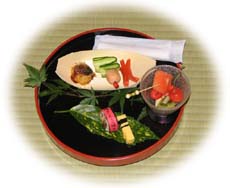 まずは、おしのぎ。お祭り屋台のイメージで作りました。(さんさ太鼓の海苔巻き、玉子焼の笛、経木の船には、たこ焼きとかにのウインナー、箸休めはフルーツカクテルです)