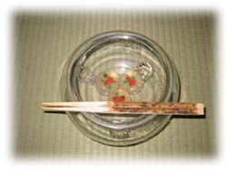 その後、薄茶を一服差し上げました。お祭りがテーマとのことで、お菓子は、水遊び(きんぎょ)、菓子器は金魚鉢、皆さんに金魚すくいをしていただきました。冠香合に、住吉神社が近いこともあり住吉棗。スタッフ一堂浴衣でおもてなしいたしました。(皆さんの歓声に水屋でにっこり)