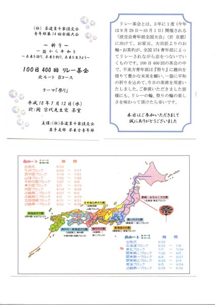 「祭り」に趣向を借りて豊かな未来を願い、一碗に平和の祈りを込めて、リレーの輪、祭りの輪の楽しさを味わっていただきました。