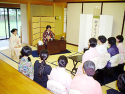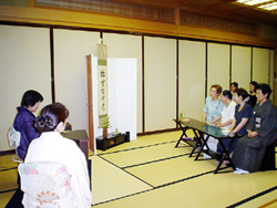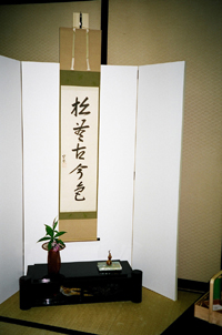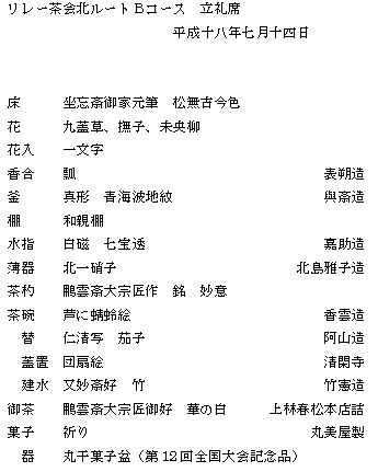 | 北海道ブロック、そして宮城支部、岩手支部のたくさんの方々の思いが込められたお家元のお軸、大宗匠のお茶杓を岩手支部より引継ぎました。 お席のテーマを「全国大会・祈り」とし、第12,13回の全国大会で出会いがあった思い出のお道具を使い、お軸とお茶杓の「松無古今色」「妙意」をお越しいただいた皆様に感じていただけるよう、「祈り」を込めて一服差し上げました。 大変暑い中でのお席でしたが、リレー茶会・全国大会の成功に向けて、主客の気持ちがひとつになる時間が共有でき大変うれしかったです。 |