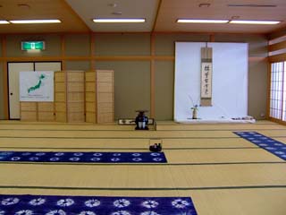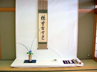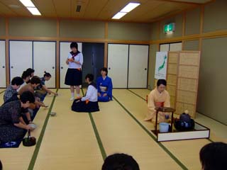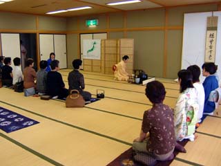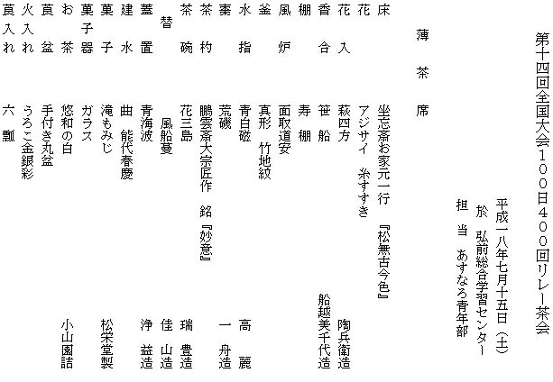 | 前日の八戸から引継ぎ、青森支部2日目となった15日、前日夜から席作りをし、当日は開始時間より早くお客様をお迎えしました。正会員、OBに加え、お運びには弘前市立津軽中学校の茶道部の生徒さん、柴田学園東北女子大学の茶道部の皆さんにお手伝いいただきました。制服姿の学生さんがお席に現れるととたんにお席が和み、笑顔のさわやかな席となりました。 北海道から東北へ、会員の熱い熱い想いを『水の流れ』にたとえてお道具を組みました。 大河となって京都に届きますように。 |