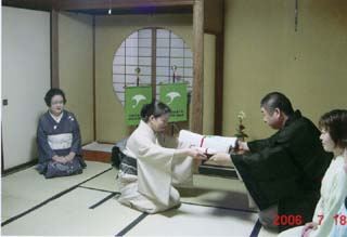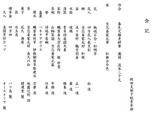 | 厳かな雰囲気の中、リレーされてきたお道具をくぼた青年部より引き継ぎ、「軸荘り」で坐忘斎お家元御染筆のお軸「松無古今色」を床の間に掛け、鵬雲斎大宗匠自作の茶杓の箱を床の間に荘り茶席をはじめました。 お席はお家元好の和親棚を使用して夏の趣向で行いました。平日の夜の茶会でしたが、親先生や青年部正会員133名のお客様にいらして戴きました。 佐竹青年部と同じ会場で行いましたので、AルートとBルートのお道具を拝見できたことに来客の皆様が大変感動していました。 全国的に雨の天気で心配しましたが、秋田は当日快晴に恵まれました。翌日に矢留青年部に無事リレーを終えて安堵と一抹の寂しさを感じました。 全国大会でリレーされるお道具に再会できる日を楽しみにしています。 |