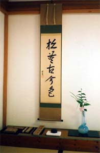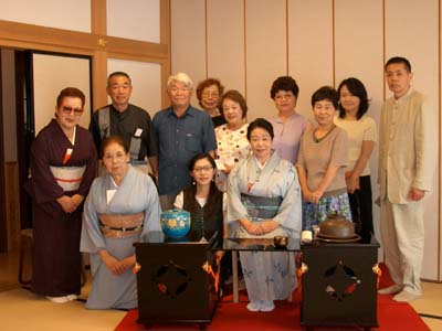 梅雨明け前で天気が気になりましたが、当日はとても良いお天気で、暑い中を地域の先生方とお社中の皆様、青年部の先輩、地元の一般の方々と多数の方々をお迎えいたしました。皆様、お家元のお軸、大宗匠のお茶杓を特に熱心にご覧になり、それぞれの『祈り』も込めていただきました。また、お軸やお茶杓を通して、『100日400回リレー茶会』や『青年部全国大会』の話にも興味をお持ちいただけたようです。