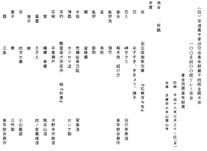| 石橋宗絹先生をはじめ親先生、諸先輩、また公民館の掲示案内やコミュニティ紙をご覧になった一般の方々も多数ご参加下さいました。鷲山寺の皆様にもお茶を召し上がっていただき、「未来」を願う道具組に和やかなお席となりました。地球をイメージした岬ガラスの花入れ、ロシア製ホフロマ塗りの見立ての薄器にストリートチルドレンの根絶を願い、香合は群馬北青年部の吉澤さんに、紙釜敷は千葉青年部の石橋さんに、菓子器はつくば青年部の奥田さんにそれぞれ教えていただいた会員の手作りで関東第二ブロックの絆と、溜精棚で全国大会の地、京都に想いをつなぎました。 待合いでは、柚ジュースで暑さを凌いでいただきながら、ユニセフの募金箱と資料で世界の子供たちの実状をお知らせし、折鶴を皆様に折っていただきました。ご賛同をいただいた募金総額は16,330円となり寄付致しました。翌日、参加者全員の「未来への祈り」をのせて館山青年部にご染筆・お茶杓をつなぎました。 青年部会員6名とご協力いただいた先輩3名の少人数のスタッフで、ご祈祷・待合・茶会と3会場に亘ってしまった為、行き届かない点が多くお客様に満足していただけたか心配でしたが、感謝の言葉や励ましの言葉をかけて頂きました。親先生方、諸先輩のご尽力のお陰で無事終了することができ、感謝の気持ちでいっぱいです。また、受付ホールに池坊の立華新風体を、茶室前に自由花を生けてリレー茶会を応援して下さいました湯浅宗雪先生社中の皆様に心より感謝致します。連日ブロック内青年部の茶会に出席してお疲れの中、群馬県を早朝から出発され、ご祈祷より出席いただきましたブロック幹事長の岡田さんにも頭の下がる思いです、ありがとうございました。 近隣の小学校にも茶会の案内を致しましたが学生の参加者が4名と少なかったことが残念でした。学生への案内方法等今後は検討したいと思います。 お家元のご染筆『松無古今色』、大宗匠のお茶杓『妙意』にこめられた教えと、鷲山寺御貫首大塚日正様の引用されたタゴールの詩が重なり、勇気を頂きました。これからの青年部活動、淡交会の諸行事、人生に生かしてゆきたいと思います。 |