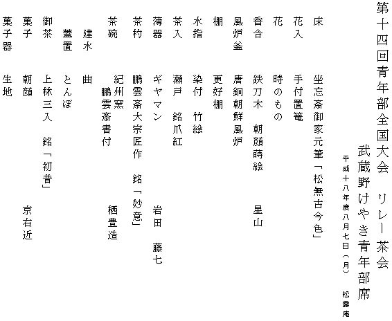 | 私共、武蔵野けやき青年部のリレー茶会は、夏の日差しの眩しい晴天に恵まれ無事に茶会を催すことができました。 今回の全国大会のテーマである「祈り」をリレー茶会で表現するのに苦労を致しましたが、「リレー茶会」へ足を運んで頂いたお客様ひとり一人に「感謝の気持ち」を私共の祈りとして心を込めて一碗を差し上げました。 香煎席で冷たい麦茶、本席では濃茶の後に薄茶を点て出しでお出ししました。 私共のリレー茶会の規模は小さいですが、会員の日ごろの感謝の気持ちが込められたお茶会となり、来ていただいたお客様にゆっくりと寛いで頂くことができました。 リレー茶会を通じて良き経験をさせて頂き、ひとつひとつの経験がこれからの成長の糧になると改めて感じることができました。 また今回のリレー茶会を行うにあたり、準備の段階から親先生や青年部OBの皆様にご指導頂きましたこと、心より感謝しております。 |