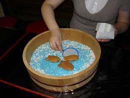 日本アイ・ビー・エム株式会社 茶修会との交流茶会として同社箱崎事業所の茶室・比鄰亭(ひりんてい)をお借りして実施いたしました。夏の盛りの暑さ厳しい季節ですので、一時の涼を差し上げようと、茶室のすぐ脇を流れる隅田川をテーマにして、お水は隅田川の源流に当たる秩父から汲んできた物を使いました。待合いでは「夏休み」を楽しんで頂こうと、お客様には懐紙で箱を折っていただき、そこに金魚に見立てた小さな鯛焼きをすくい取って頂く趣向で楽しんでいただきました。そして本席ではお家元のお軸と大宗匠の茶杓を使わせていただき、川に因んだ取り合わせでお茶を差し上げました。また毎年春の青空茶会でも一緒に手伝っていただいている東洋大学の茶道部の方たちもご参加いただき席にお入りいただきました。台風の嵐で始まった茶会も夕方には天気も回復し、午後十時過ぎ駒沢青年部にお道具を引き継いで無事茶会を終了いたしました。