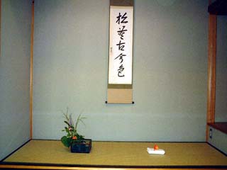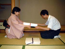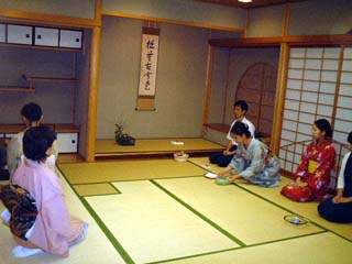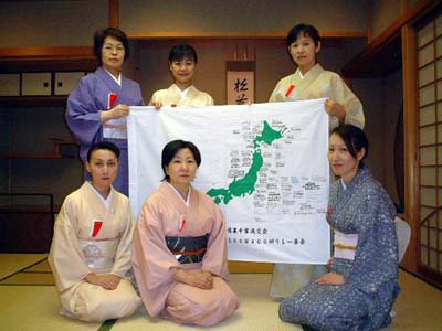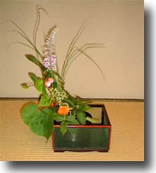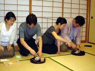 | わたくしどもの青年部では、会員のご家族をお客さまとしてお招きし、日頃の青年部活動を見ていただくことで、青年部に対するご理解とご協力をお願いしたいと考えました。 終戦記念日ですから、戦争で犠牲になった子どもたちへの鎮魂の祈りを込めて、「夏遊び」を主題に、ピクニック風煙草盆、ほおずきの香合、虫かごの花入れ、金魚鉢にハスの葉蓋、西瓜の薄器、建水は桶というように身近にあるものをお茶道具として使い、初めての方にも親しんでいただけるよう工夫いたしました。 お点前終了後に、お茶の経験のないお客さま方には、お盆に棗と茶碗を用意して、ご自身でお茶を点てていただくという体験もしていただきました。慣れない手つきで一心に茶筅をふっていらっしゃるお客さまの真剣な表情もさることながら、会員のみなさまがそれぞれに妻の顔・母の顔となって、心配そうに見守ってらっしゃる様子がほほえましく、なごやかな雰囲気の中、お茶会を終了することができました。 お家元、大宗匠のおかげで、リレー茶会に参加するという機会にめぐりあえましたことを感謝いたしますとともに、細やかなご配慮とご指導くださいました親先生方に重ねて御礼申し上げます。 |