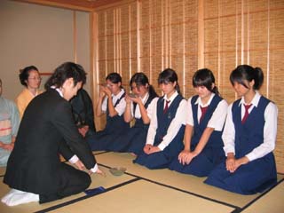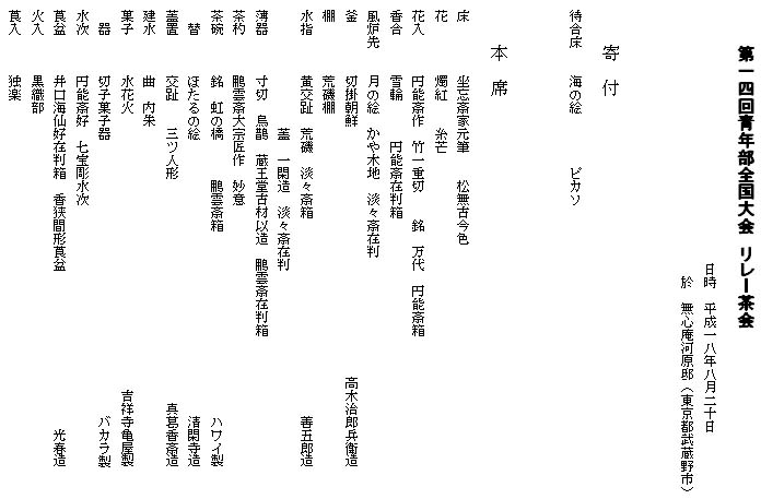 | 全国大会の「祈り」と関連させ、「虹の掛け橋」をテーマとし、60名の方が集う茶会となりました。 ハワイ製の「虹の橋」という銘の茶碗を使用し、また、相談役のご自宅のお茶室を使わせて頂くことが出来ました。青年部が親先生と学校茶道の若い人達の掛け橋となるよう、80歳を過ぎた淡交会免除会員の先生、中学生、大学生を客として招待しました。 中学生達は、坐忘斎お家元の軸、鵬雲斎大宗匠の茶杓を大変興味深く拝見し、熱心に説明を聞いていました。参加者はお道具をリレーする茶会が全国で100日400回毎日行われていることに、皆驚き、その企画の一端を担えたことに喜びと誇りを感じていました。大きな会場の慌しい茶会ではなく、個人宅なので、和気あいあいと一日楽しむことができました。 機会を与えて下さったお家元、支えて下さった親先生、OBの先輩達に感謝するとともに、これからも掛け橋としての役割を全うしたいと思います。 |