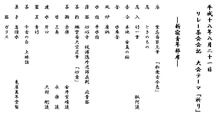 | 新宿青年部はリレー茶会を催すにあたり今回のテーマ「祈り」について話し合いました。祈りは心の誓いであり、その誓いは行動をもって表現されるべきであると考えました。 お家元と大宗匠の想いを地域の皆様にお伝えする為に我々が誓い、実行すべき事は「手作りの茶会」であると考えました。酷暑の中お出まし頂いたお客様にゆっくりとくつろいで頂くため点心席を設け青年部会員による手作り弁当とお汁を出すことに致しました。前日から当日の茶会が始まる直前まで弁当作りと茶席の準備に追われましたが、茶会が始まると皆いつものペースを取り戻し無言の内に交わされる会話や合図に一体感を感じることが出来ました。お出まし頂いたお客様も皆さわやかな笑顔と会話で席を盛り上げて下さり、只々感謝の気持ちと充実感に満ち溢れた一日を過ごすことが出来ました。 「茶室に溢れる笑顔と感謝の心」こそお家元と大宗匠の「祈り」そのものであると会員一同話し合いあらためて感謝申し上げた次第であります。 |