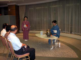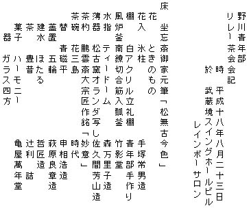 | 処暑を迎えましたが、まだ夏の色濃い一日、私ども野川青年部に御家元のお軸と大宗匠のお茶杓がリレーされて参りました。 武蔵野と都心の景色の両方を一望できる会場で支部長先生を始め多くの親先生また青年部の先輩方にご出席を頂き、和やかなお席となりました。 白いキャンバスに青年部会員皆の色々な個性で、虹色のハーモニーの輪を描くような爽やかなお席づくりを心がけました。 親先生並びに青年部の諸先輩方のご指導、お力添えを賜り誠にありがとうございました。 |