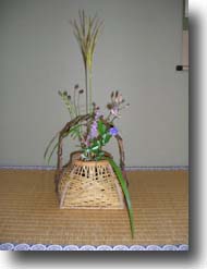 訪れる季節の移り変わり、それを五感で感じ、楽しむ心のやすらぎ。そんな当たり前のことを楽しめる「平和」がいつまでも続くようにという思いを、本年度の全国大会のテーマである「祈り」に託したいと思い、本席では、晩夏から初秋への季節の移り変わりを感じていただこうと、「夕日」をイメージしたボヘミアングラスの水指、「月」をイメージした菓子器、「初秋」をイメージした瓢のお菓子をご用意し、長板二つ置のお点前を致しました。