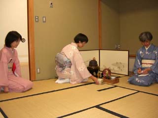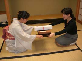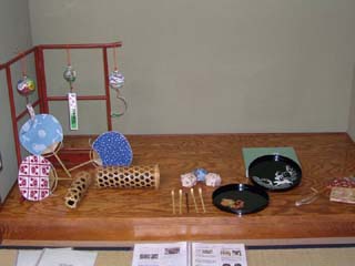 暑い中をお越しいただいたお客様には、待合で「冷やしあめ」をお出しして、席入りまで涼み、おくつろぎいただきました。また、青年部の活動内容を見ていただき、理解を深めていただくための手がかりとして、これまでの行事で制作した作品(茶杓、蒔絵盆、風鈴など)を展示し、行事レポートをファイリングしたものを3冊ご用意して、閲覧していただけるようにしました。