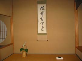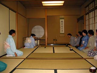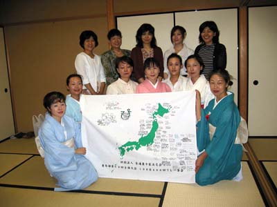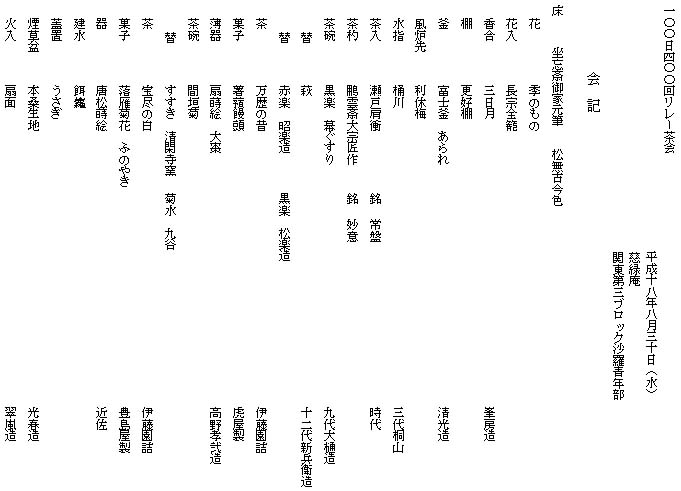 | 蒸し暑いながらも秋の気配が感じられる中、日頃お世話になっている支部の親先生はじめ南ルート青年部からのお客様もお迎えし、続き薄茶にて和やかにお席を持たせていただきました。 リレー茶会についての話が席中で弾むうちに、全国大会への期待が膨らみます。今回参加出来ない会員や先生方にも理解を深めていただけたと思います。 平和への感謝をこめて茶会を無事に終了し、翌日開催のはまなみ青年部にお軸とお茶杓をリレーいたしました。 |