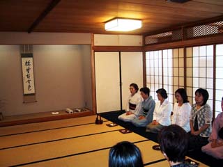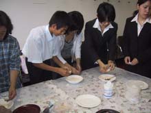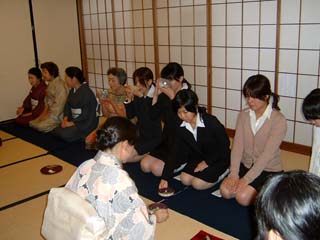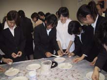 | 「未来への祈り」をテーマに、学校茶道との関わりを模索しながら、今回のリレー茶会を担当させていただきました。あいにくの雨模様の一日でしたが、鎌倉支部の幹事長先生、副幹事長先生方、また、学校茶道の多くの先生方、そして鎌倉女子大学の茶道部の皆さん、青年部OB・OGの諸先輩、と多くのお客様をお迎えして、大変楽しい茶会となりました。 お客様には、まず、別室でお菓子作りのミニ体験をしていただきました。落雁の型抜きと三色団子を丸めて串に並べる、という簡単なものでしたが、初めての方も多く、にぎやかに楽しまれていたようです。そのお菓子をお持ちいただいて、お席入り。広い和室をゆったりと使った席で、薄茶を召し上がっていただきました。学生さん達が、ご自分で形作ったお菓子をおいしそうに口にされていて、とても微笑ましく、うれしく思いました。 菓子作りの部屋、和室ともに、青年部の日頃の活動をPRするスペースも設け、合間にご覧いただきました。学生さん達から「青年部って楽しそう」「こんなことも教養講座で教えていただけるんだ」「私もやってみたい」という声も聞かれ、これからの青年部活動の励みともなりました。 |