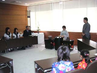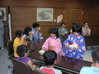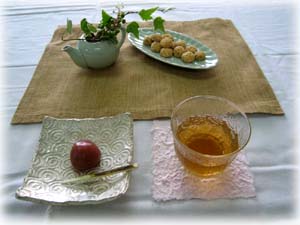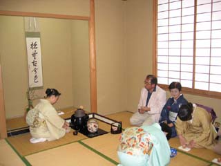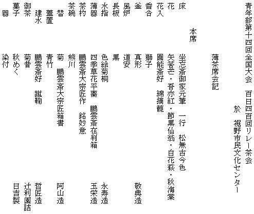| 狩野川青年部では9月2日、裾野市民文化センターにて、支部役員の先生、親先生をはじめ、隣の沼津支部青年部会員等大勢のお客様をお迎えし開催致しました。 薄茶席は重陽の節句、立礼席は説話「月のうさぎ」を元にしたお月見の趣向で、秋めいた空気を感じさせる、さわやかなお席が出来たのではと思います。 立礼席では、昨年・今年の伝統文化子ども教室に参加している子供たちが、浴衣を着たかわいい姿でお運びをし、お席に彩りを添えてくれました。 さらに香煎席では、冷たい中国茶と手作りのいちじくのコンポートでおもてなしをいたしました。 今回は学校茶道連絡協議会にご案内を出し、生徒達にも学生割引の500円にて参加して頂きました。文化祭などの行事で呈茶をしたことはあっても、和室を使用した本格的な茶会に参加するのは初めてという生徒さんもいて、お家元の軸や大宗匠の茶杓を拝見し、席を構成するテーマに沿った道具の取り合わせや、季節を感じさせるしつらえに喜んでもらえた様子。「これからもお茶を続け、青年部に入会します!」の嬉しい声も聞かれました。 学生や子供たちの茶道に対する真摯な姿勢に、輝く未来を予感させられた1日でした。 |