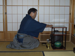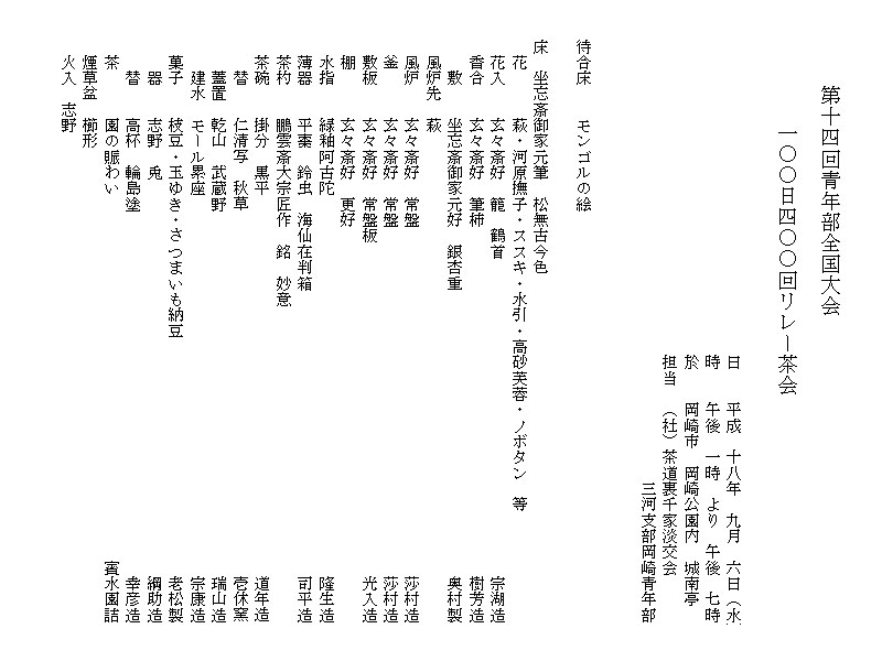 | 当日は、降ったりやんだりのあいにくの、お天気でしたが、多くの先生や同門の方々が、お越しくださいました。 玄々斎宗室生誕の地より、受け継がれていくいにしえの心を大切にしていく思いを込め、祈り(願い)を月に表しました。お道具も玄々斎宗室ゆかりのもので揃えさせて頂き、これからの岡崎青年部が実りあるよう実りをテーマとしました。お菓子も枝豆、さつまいも、玉ゆきと三種ご用意させて頂き、実りの秋を感じさせるものでした。と、同時にお客様に少しでもゆっくりしていただきたい思いを込めさせていただきました。当日の雨も実り多い日を迎えるには、雨も必要(めぐみの雨)だということなのかもしれません。 |