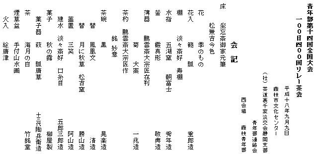 | 暦では『白露』を過ぎ、新たな季節の訪れを感じつつも暑い、熱い79日目リレー茶会を開催させて頂きました。引渡し式での御家元のお気持ちを大切に心にとめ、取り組んでまいりました。テーマに添って「和」を持ってまた季節を感じていただける趣向とさせていただき多くの皆様にお越しいただく事が出来ました。 所感 静岡支部青年部連絡会では79日目は2会場に分かれ東会場がAコース西会場がBコースのお道具にてさせて頂きました。引き継がれてこられたお道具を前に、坐忘斎御家元、鵬雲斎大宗匠の青年部への大いなる期待が込められている事を感じ、本当に緊張の中、身の引き締まる思いをいたしました。また私達1人1人が自覚を持ち足元を見つめ直し、日々の積み重ねの中でこそ末来があるのではないかと感じました。全国の青年部との繋がりを感じ私達青年部一同気持ちをひとつにして全国大会に向かってまいりたいと思います。またリレー茶会には親先生のご協力をいただきました本当にありがとうございました。 |