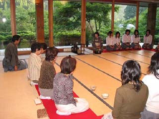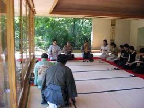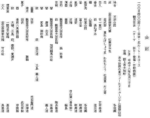 大和町古今伝授の里・篠脇山荘をお借りして開始時刻よりやや早い14:30からのスタートとなりました。平日にもかかわらず、塩谷幹事長先生はじめ支部の先生方、地域の方々、東海ブロックの仲間、学生さん方、大変多くの方にお出で頂きました。前日までの空模様とはうって変わって、秋晴れの清々しいお天気に恵まれ、一面ガラス張りの窓からは郡上の山々を望める開放感あふれたお席での茶会となりました。
