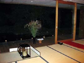 昼間は秋晴れの空と山々の景色を、夜はあいにく新月の頃で観月とまではいきませんでしたが、カエルのソロをBGMに竹筒に明かりを灯し、心地よい風を感じる秋の夜を楽しんでいただきました。昼、夜と違った趣でのお茶会を一度に出来るということで私達青年部会員にとっても、よい経験となりました。