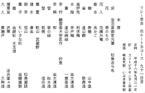 | 岐阜県の最終日を担当させていただきました。 当地、大垣は水都と呼ばれ伊吹山や養老山といった名水の沸き出でる泉が点在しており、また芭蕉が奥の細道を結んだ地としても有名です。 この度のリレー茶会はそんな水都で、行く秋を静かに感じていただき間近に迫った全国大会に思いをはせていただこうと言う想いで、シンプルに”小さな秋をさがして”というテーマでさせていただきました。 平日でしたが、多くの先生方にお越し頂き、大変うれしく思いました。 3時に席を開けさせていただくと同時に、先生方がおいでになりその後は、OBや他青年部の仲間達が入れ替わり来て頂けると言った様子で最終8時にまで滞りなく勤めさせていただきました。御協力いただきました先生方、参加してくれた会員に感謝いたします。 |