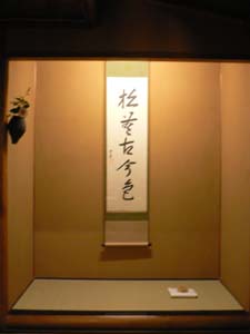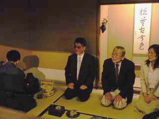 | 100日400回リレー茶会95日目を担当させていただきました。私たちの青年部は北ルートのBコース。 前日に東海ブロックからバトンを引き継ぎ平成元年・2年度西山青年部部長で現在監事をお願いしています長田光彦先輩のご協力で四条河原町という京都中心的繁華街にある龍善堂の龍庵という4畳半の茶室でさせていただきました。 地下に下りるアプローチには先日の青年部行事で竹細工体験をしたときに作った竹かごに秋草を生けました。 全国大会のテーマである“祈り”そして近くに染殿地蔵という安産祈願のお寺があることから、これからの日本を担う子供たちがたくさん生まれ、子供たち、そして私たちを守ってくださるという地蔵菩薩をサブテーマにして洛中だということを忘れるくらいの静けさの中、これも近くにある錦天満宮の名水“錦の水”でゆっくりとお茶を楽しんでいただきました。 |