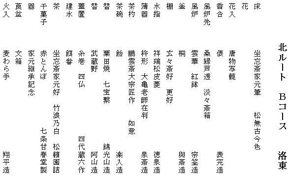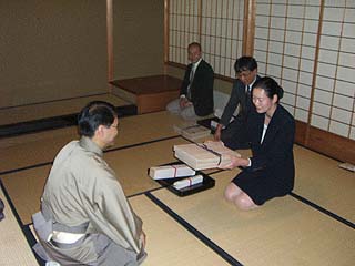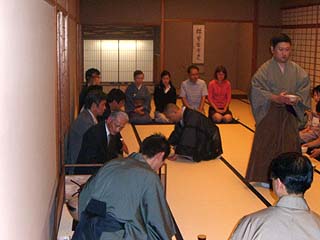 | 北ルートAコースの濃茶席に引き続き、北ルートBコースの薄茶席は、メンバーのお茶屋さんがお家元より拝受した薄茶のお茶銘を皆様にご披露することにいたしました。お席の始まる直前、再び本人をお点前に指名し、もう一度サプライズさせました。 われわれ京都東支部は、何かをふと思いついたり急きょ変更したりと即興性の高いのが特徴ですが、今回のリレー茶会においても、あわただしい準備や刻々と様子が変化する茶会の中で、会員各々がまかされた役割や仕事をそれぞれ臨機応変にこなしていました。 濃茶席の緊張感とはうってかわって、お客様も青年部会員も和やかな雰囲気となり、夜が更けてくるのも忘れて談笑していました。 |