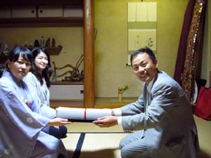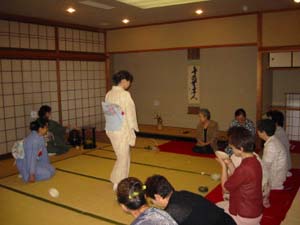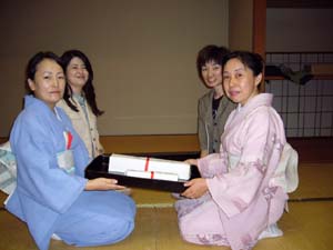 | 小雨の降る中、和やかにお茶会が行われました。 ウィークディの月末とかなり厳しい状況の中で行われたにも係わらず、諫早青年部 8名、大村青年部 3名、ご招待 8名の方に参加して頂きました。お花はハンゲショウ、チヤガススキ、ガンピを入れ、お菓子は紫陽花をあしらったものを用い、大変好評でした。 沖縄を出発した大宗匠のお軸とお家元のお茶杓を拝見したとき、日本全国の青年部の方と同じお軸とお茶杓を使わせてもらい、お茶会ができる喜びをあらためて感じ取ることができました。このような臨場感あふれるリレー茶会がもっと大きなうねりとなり、全国大会に繋がっていくことを願っています。 このリレー茶会を開催するにあたり、迫田ブロック長をはじめ、ブロック役員の方々に感謝したいと思います。 |