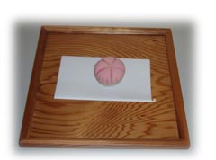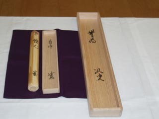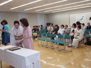 梅雨明け宣言が待たれる中、週明けから鹿児島は快晴の日が続き、お天気の心配だけはする必要もなく、当日を迎える事ができました。坐忘斎お家元様のお茶杓と鵬雲斎大宗匠のお軸は、前日の夜鹿屋市のおおすみ青年部から手渡されてきており、お道具を手にし、箱を開けた時の緊張と感動は何とも表現できないものでした。宗家から手渡されてきたこのお軸とお茶杓に込められた意味や坐忘斎お家元様の全国大会にかける期待などをうまくお客様にお伝えすることができるだろうかと一席目の席主を務めることとなった私の不安や緊張をほぐすかのように、先輩の方たちから「湯脇さん 平常心よ。」と声をかけられ、その言葉に励まされ、お客様をお迎えしました。